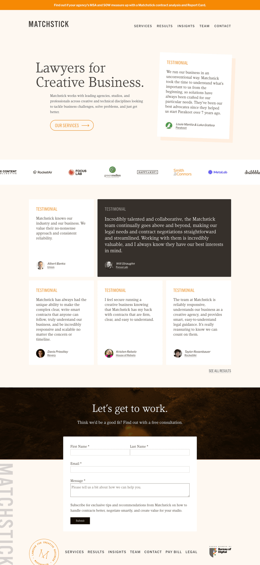 Our lawyers, Create Legal, joined forces with Gabe Levine (of Fuck You, Pay Me fame), to form Matchstick Legal. They tapped our buds, Factory North, to design them a website — which we had the pleasure of building.